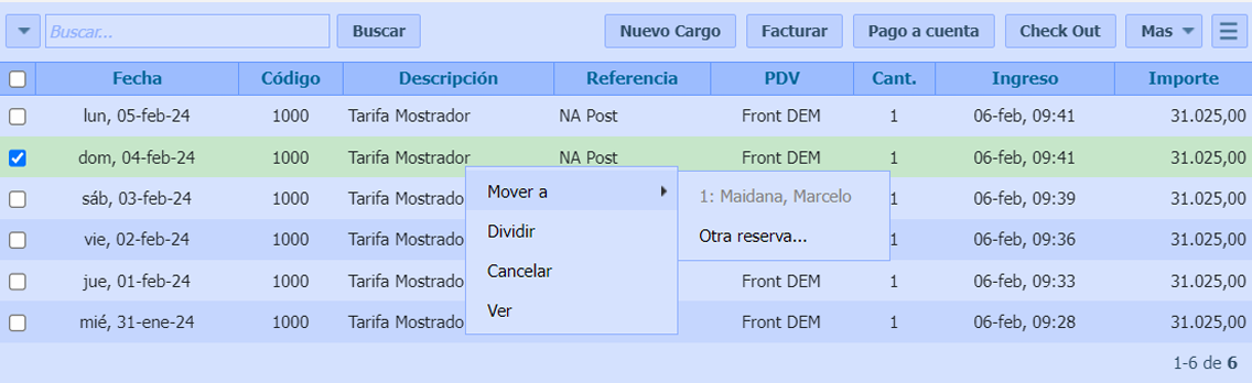 adicionales: Mover a, Dividir, Cancelar y Ver. Mover a, permitirá cambiar de Folio/Reserva los cargos. Con la opción Dividir se podrá separar un cargo en múltiples partes, de acuerdo a lo
